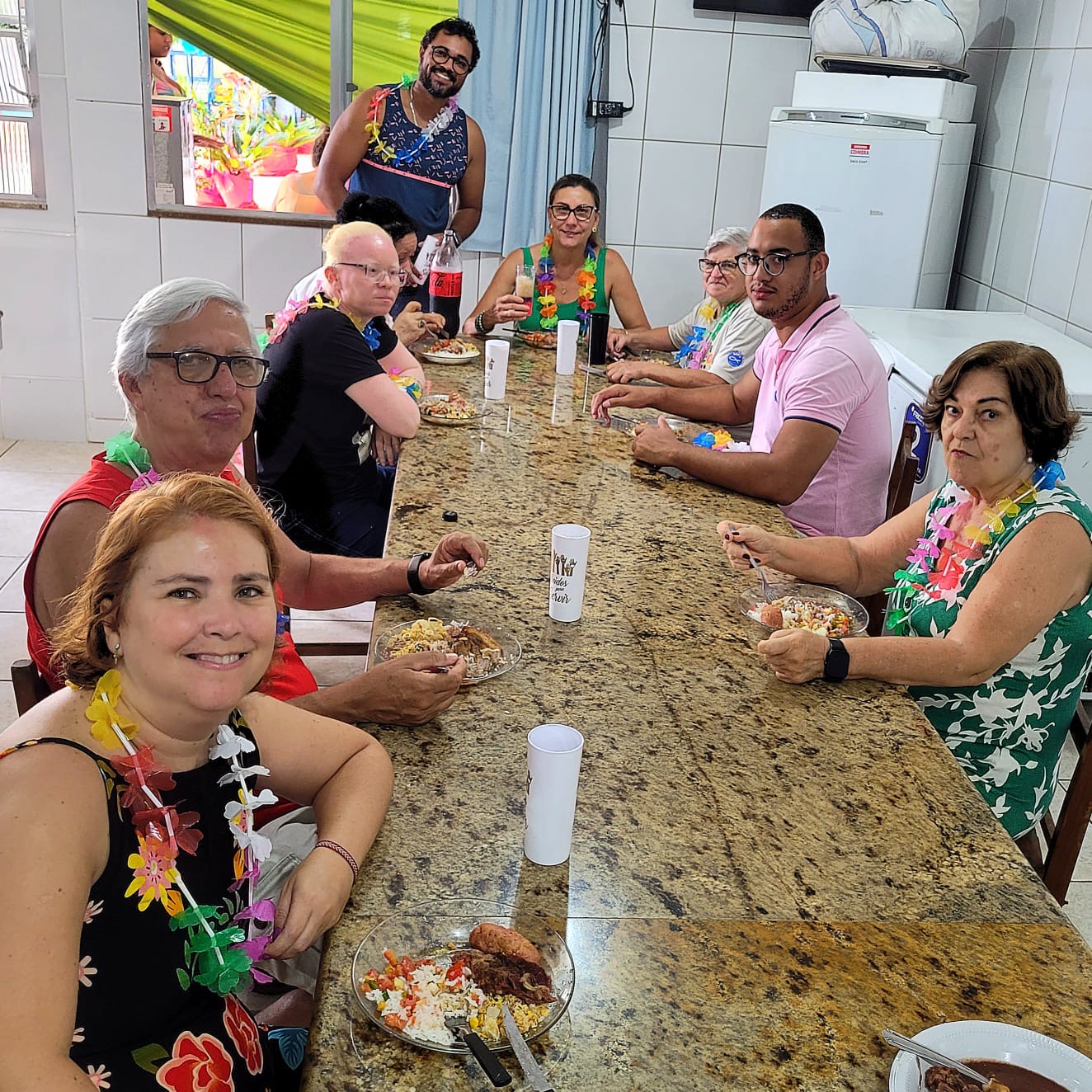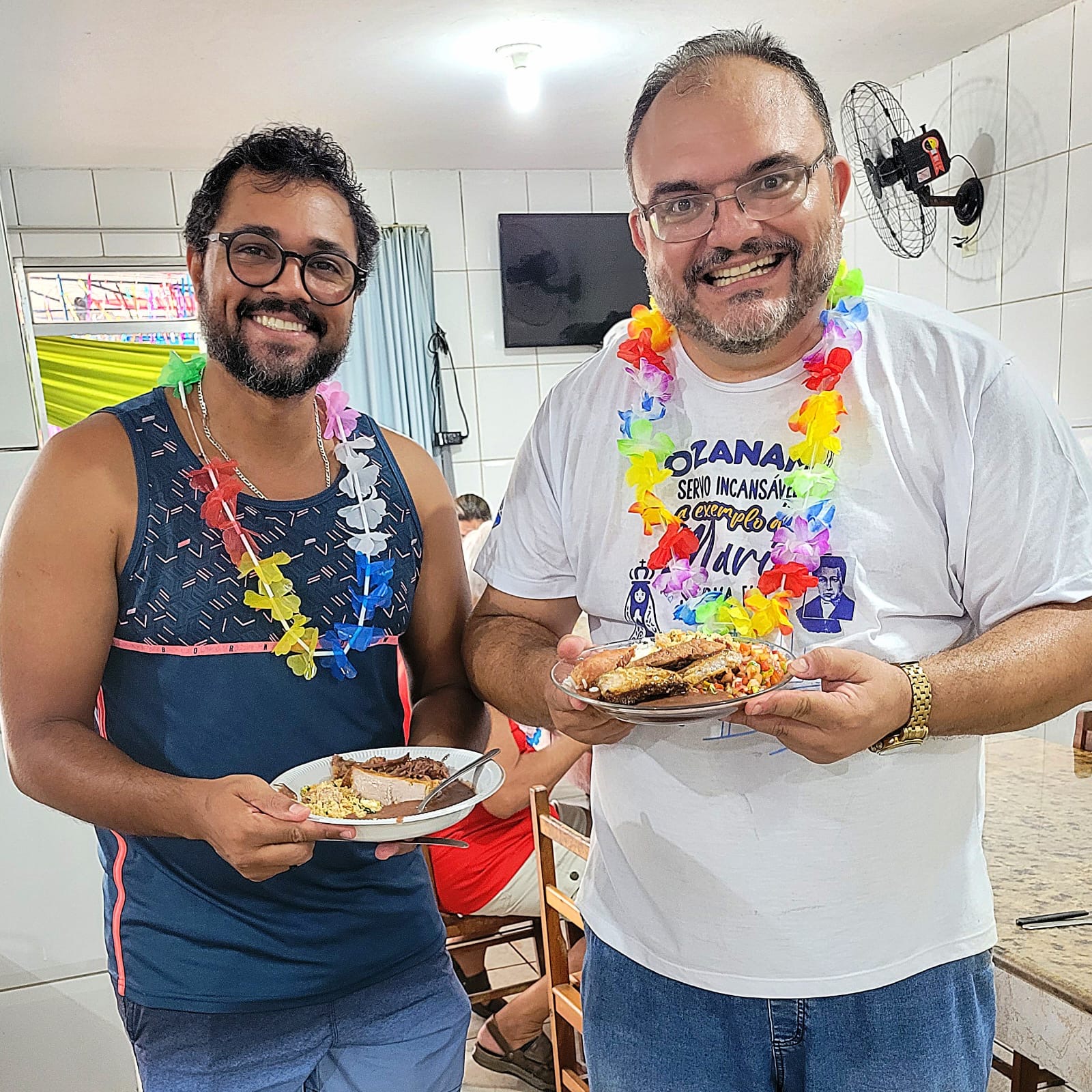 A programação especial começou com um almoço caprichado, que trouxe arroz, tutu, farofa, vinagrete e um variado churrasco com carne de boi, porco e linguiça assada. Para acompanhar, foram servidos refrigerante, sucos geladinhos, e, para adoçar a tarde, não faltaram bombons de chocolate, picolés, cocadas e uma seleção de frutas frescas.